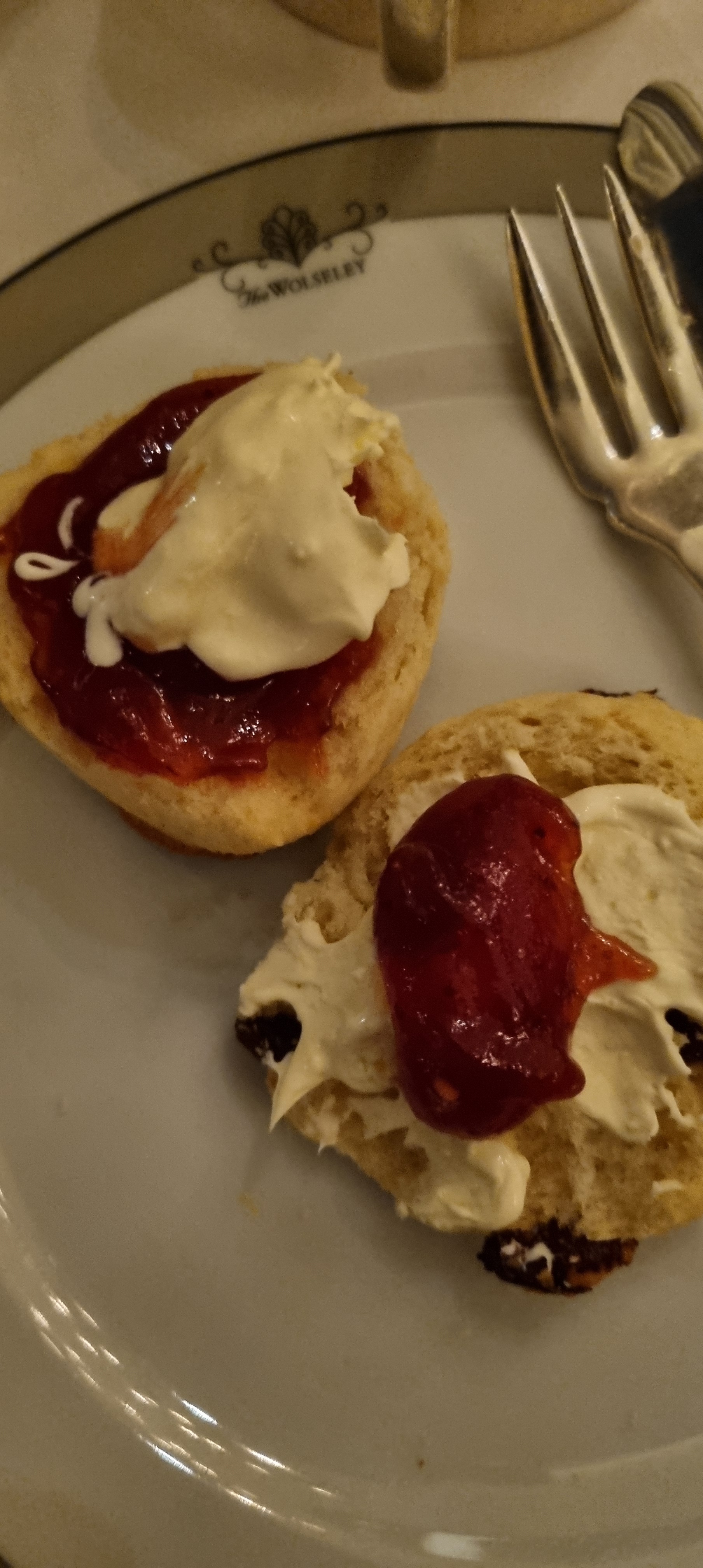 Taste-wise, unless you are an acrobat, it is the scone itself that will hit your tongue first. The mess created, jam moustache or nostrils full of cream, is about evens. If you are in Claridges use a napkin not your sleeve. A small win here for cream on top because as the scone tumbles and crumbles in the mouth, my preference is to get the cool creaminess first and the sugary strawberry hit second, but it is a matter of fine margins and not the determining factor.