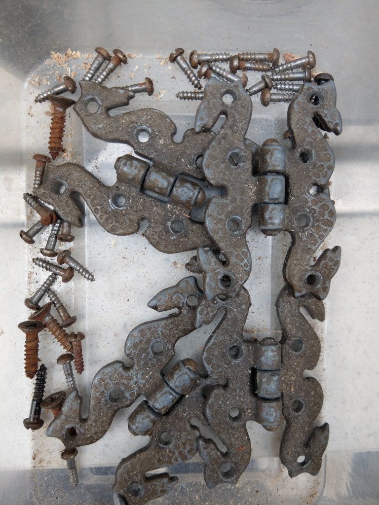I don’t actually like the hinges, and I don’t see how they fit the overall style. There are no holes indicating other hinges were once used. I’ve stuck with these for now, but I can see a future in which they are replaced.